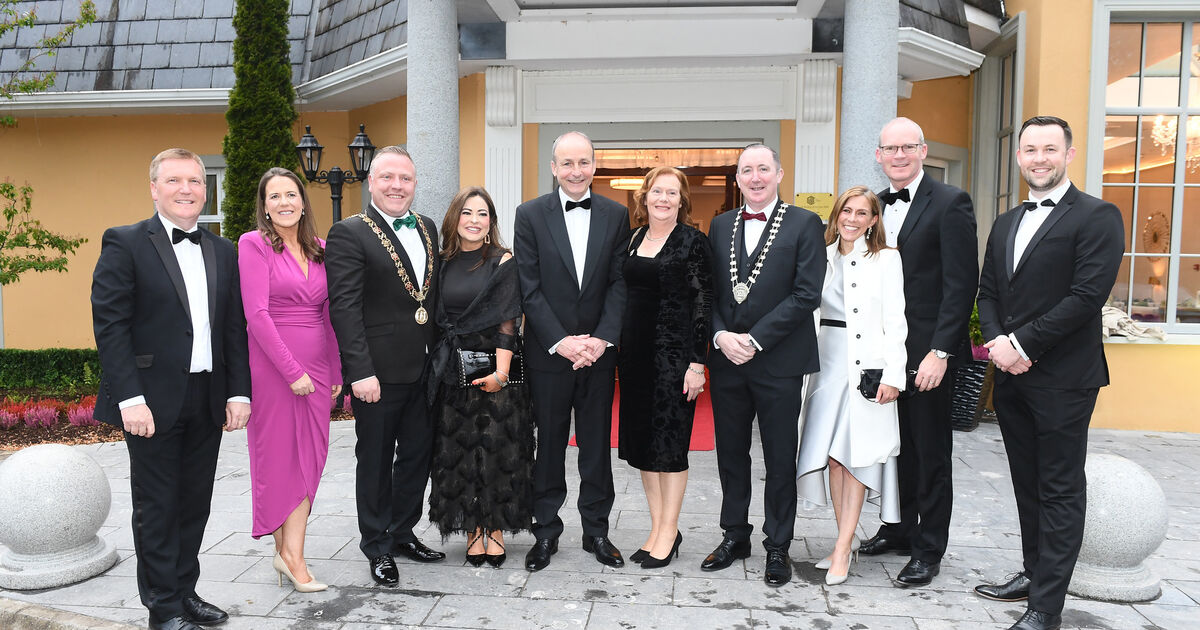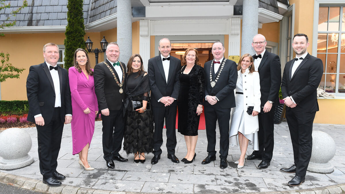 Michael McGrath, minister for public expenditure and reform , Helen McGrath, The Lord Mayor of Cork Cllr Colm Kelleher, Sandra Murphy , An Taoiseach Micheal Martin,Mary Martin, Kevin Herlihy, president CBA; Ruth Coveney, Simon Coveney, minister for foreign affairs and Eoin O'Sullivan vice president CBA at the CBA presidents dinner and Cork business of the year awards at The Vienna Woods hotel . Picture; Eddie O'Hare