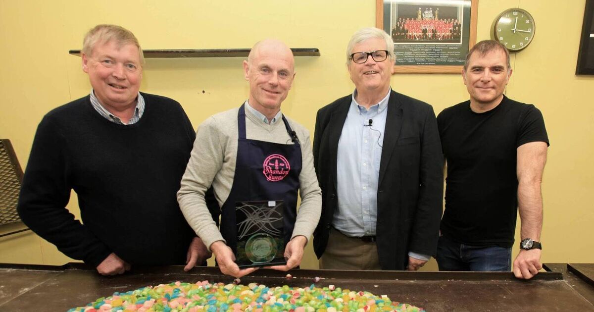 Shandon Sweet Factory, located in the heart of old Cork City, is one of the oldest small businesses still manufacturing sweets in the traditional, handmade way. Owner, Tony Linehan, and his father Dan, received Cork Persons of the Month awards to mark their unique business history. Pictured L/R: Pat Lemasney, Southern; Tony Linehan, May Cork Person of the Month; Manus O’Callaghan, Awards Organiser; and Philip Healy, Southern. Photo by Tony O’Connell.