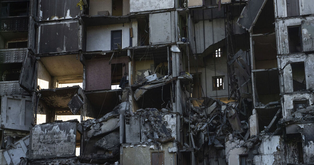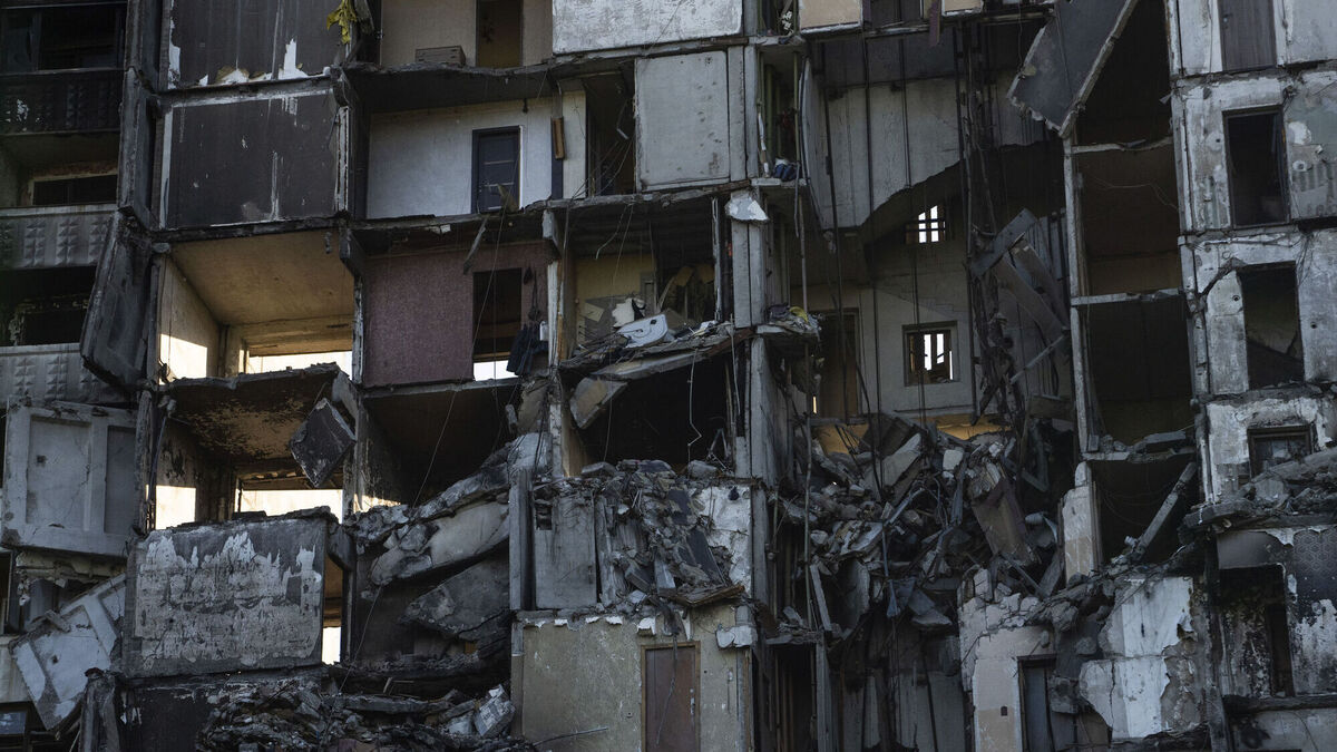 A view of a building which had been destroyed in a Russian attack in Kharkiv, Ukraine, Friday, July 1, 2022. (AP Photo/Evgeniy Maloletka)