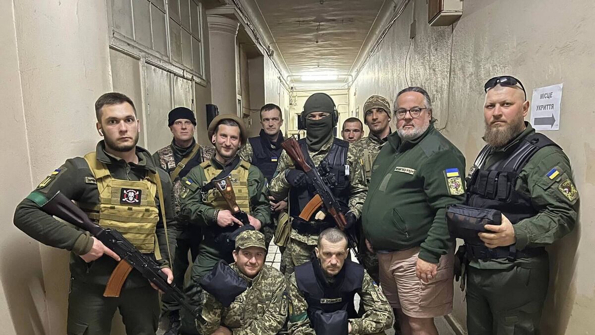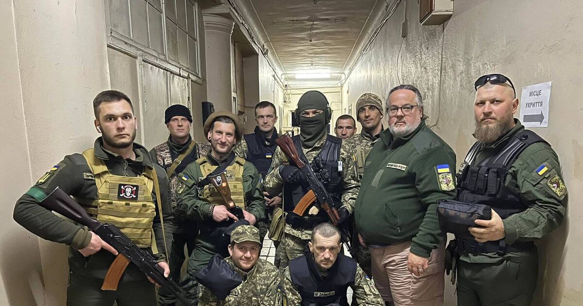 Miceál O’Hurley (second from right), who is a former United States special forces soldier decorated for valour, initially travelled to Ukraine to report on the atrocities but found himself braving the frontline to protect wounded civilians.