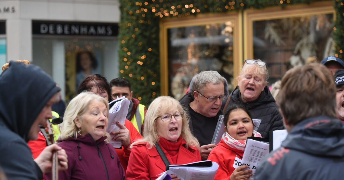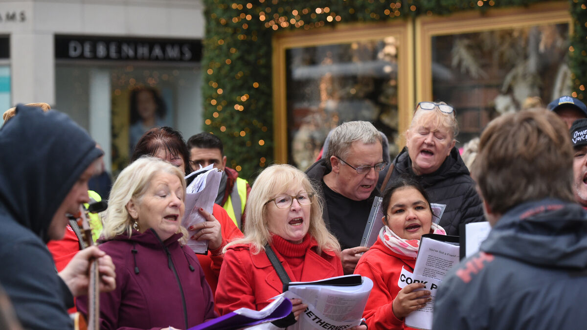 Patsy McCarthy, Delores Hughes, Miriam O'Shea and Caitriona Twomey singing with The Cork Penny Dinners High Hopes Choir as they perform at St Patrick's Street, Cork City, in 2021. Pic: Larry Cummins