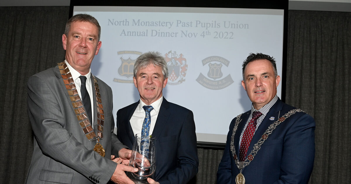 Paul Moynihan, president North Mon PPU presents Frank Buttimer, with past pupil of the year 2022 award, with Cllr Damien Boylan, deputy Lord mayor at the North Monastery PPU dinner held at the Clayton hotel. Picture; Eddie O'Hare