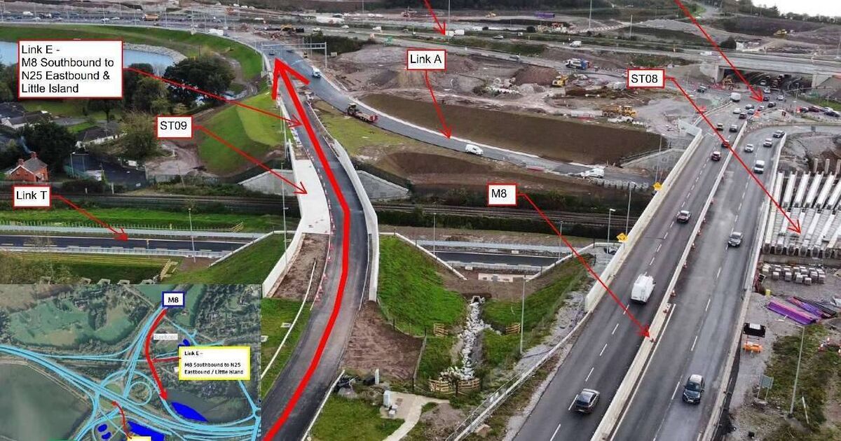 ‘Link E’ provides a free-flow link for southbound traffic on the M8 wishing to head east on the N25 or wishing to access Little Island.