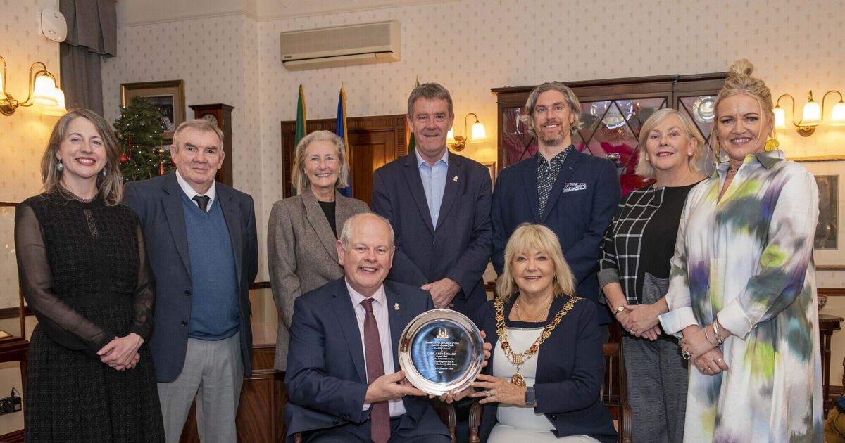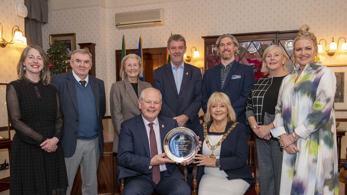 Cllr. Deirdre Forde, Lord Mayor of Cork, makes a presenation to David O'Brien, Cork City Librarian to mark the special occasion. Also incluced are, from left: Mairead Mooney, UCC Libraries; Tom McCarthy, Former Cork City Librarian; Adrienne Deasy and Paul Moynihan, Cork City Council; Alan Noonan, Historian in Residence, Cork City Libraries; Ann Doherty, Chief Executive, Cork City Council and Patricia Looney, Cork City Library. Pic: Brian Lougheed