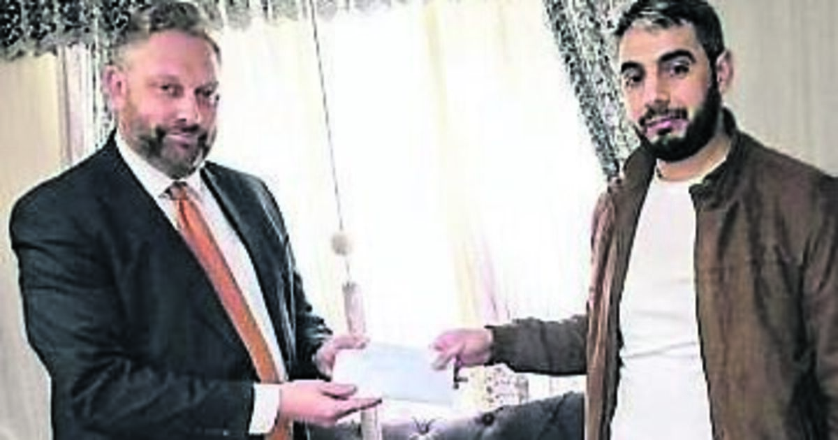 Cheque presentation by Principal Fergus O'Brien to Abdul Bakkour.