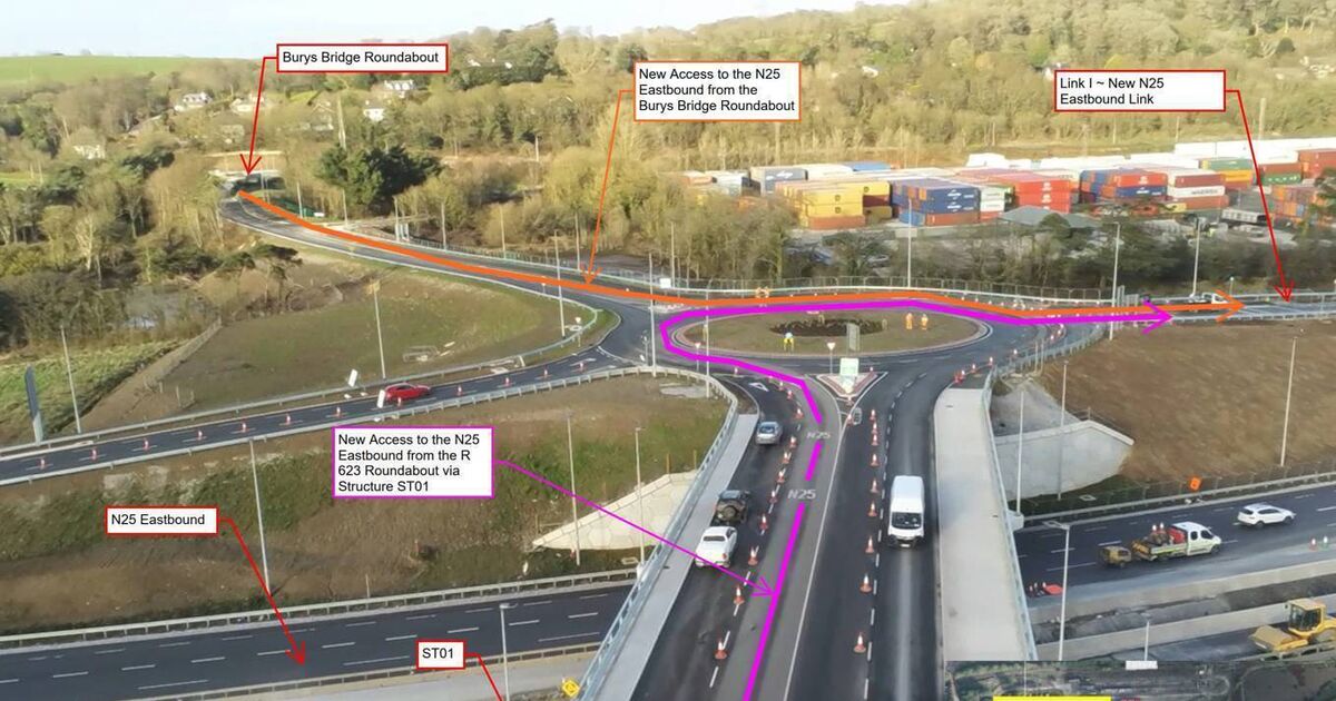 A new link road, link M, will ultimately provide the link from the southern roundabout of the new interchange to the N25 Westbound.