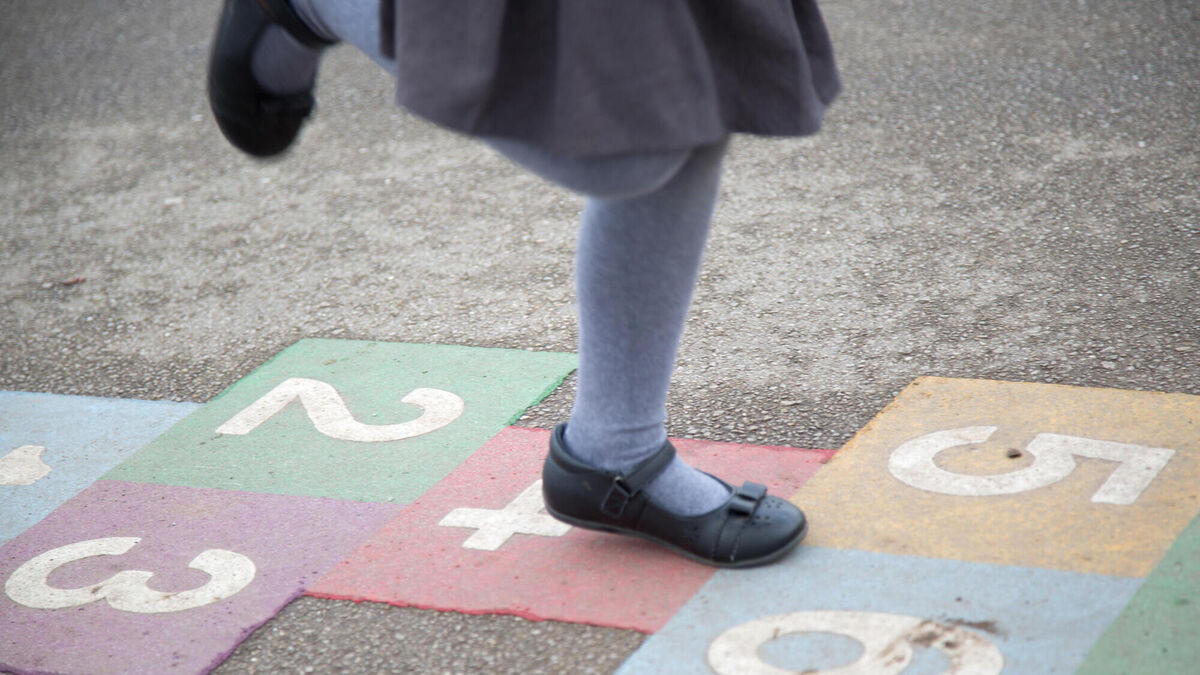 EJ17GT UK schoolgirl playing hopscotch in the playground of a UK primary school