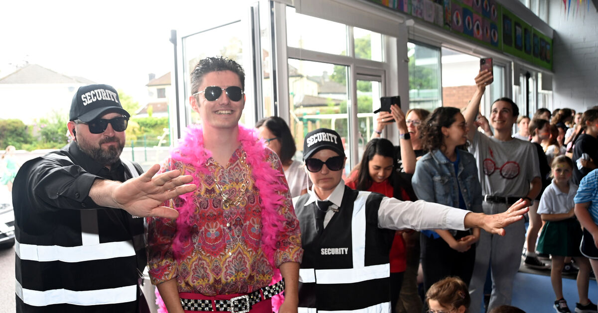 had the crowd in hysterics, and a kiss on the hand from Harry – “I’ll never wash my hand again” – nearly resulted in a teacher fainting before a live studio audience.After the gig, as Harry signed autographs on t-shirts, his security detail of Niall Daly and Arlene Pope struggled to maintain order (they didn’t, really, everyone was lovely).