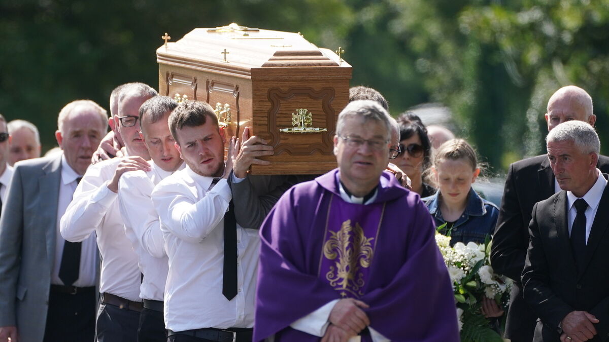 Father Gerry Boyle walks in front of the coffin of Brendan Wall as it is carried from the Church of St Brigid in Grangegeeth, Co. Meath, following his funeral mass.