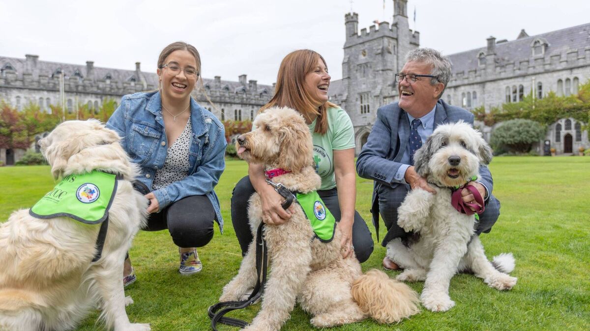 UCC student Maeve Bartnett, Cliona O’Rourke of My Canine Companion, and UCC president Professor John O’Halloran with trained service dogs Jackie, Belle, and Polly at the launch of the MCC PAWS @UCC programme. Image Credit: Max Bell/UCC.