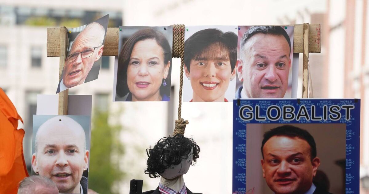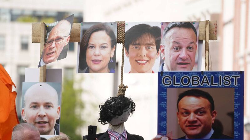 The gallows, which featured an effigy of a man hanging from a noose, was adorned with portraits of politicians including Taoiseach Leo Varadkar and Sinn Féin leader Mary Lou McDonald.