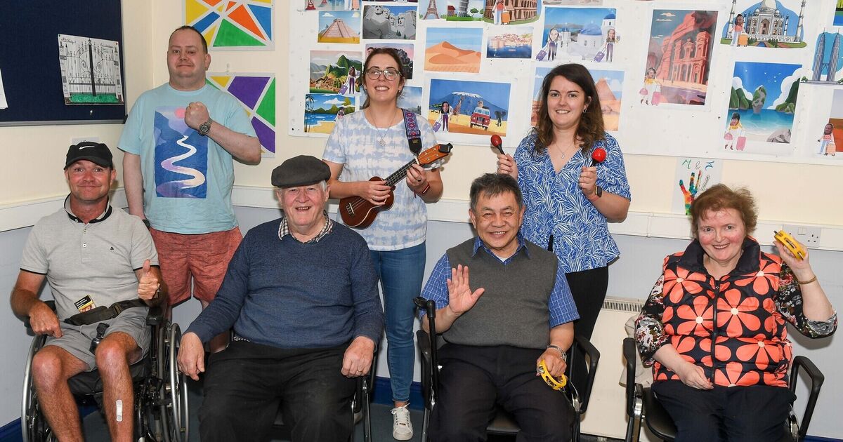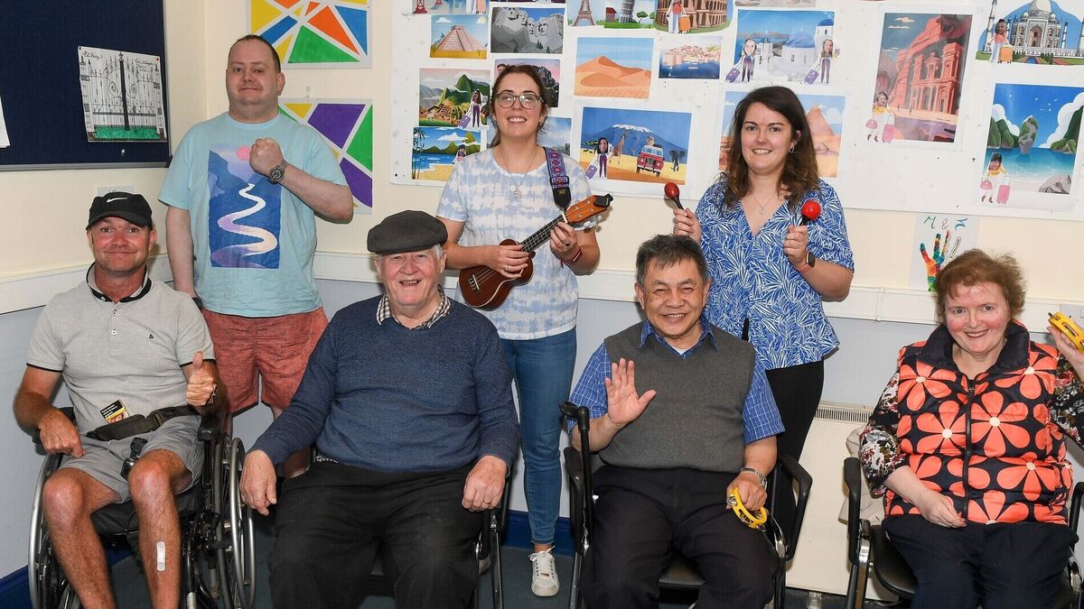 Staff members Esther-Anna Bennett and Laura Gowen with clients, from left, David McCullagh, Crosshaven; David Keohane, Ballyvolane; Joe Buckley, Ballincollig; Bobby Chan, Inniscarra, and Maureen O’Riordan, Newmarket, taking part in a music session at the Headway day service in Ballincollig.