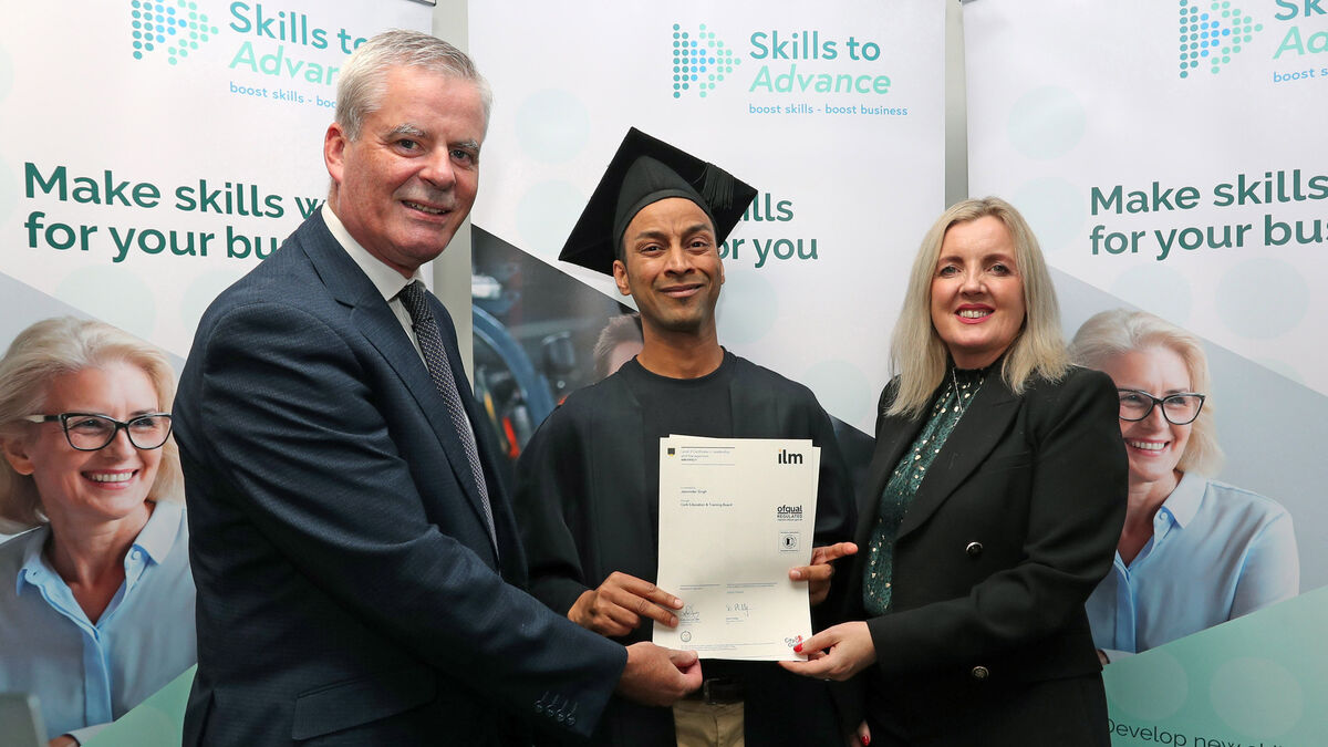Niamh Gaine, assistant manager Cork College of FET Bisopstown Campus presenting Blaise Fernandes with his certificate. Also included is Fergal Harte, general manager The Kingsley Hotel, at the Institute of Leadership & Management (ILM Level 4) graduation ceremony at the Cork College of FET Bishopstown Campus, Bishopstown.
