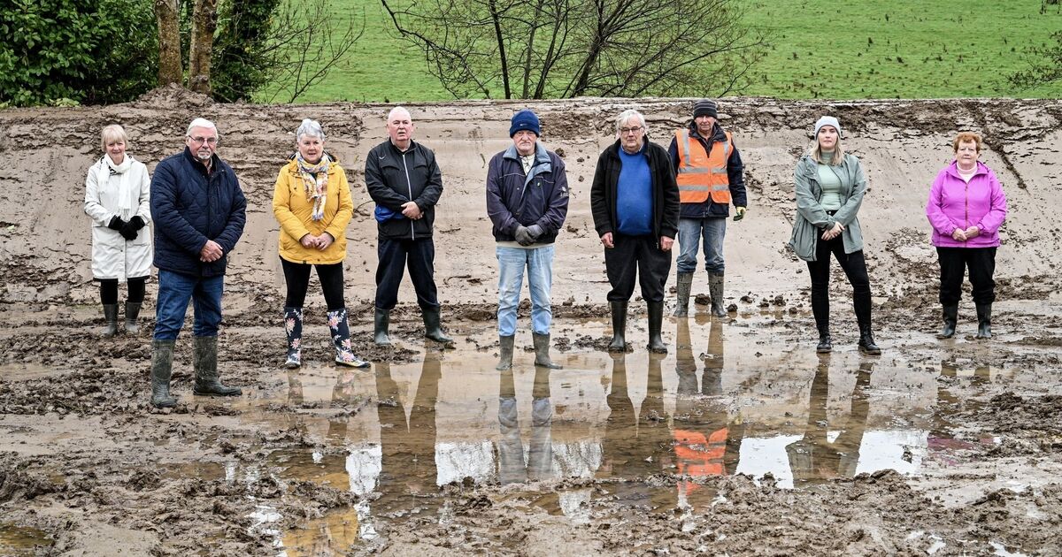 Residents of Tullig Beag and Tullig Mór in Ballinhassig, Cork stand together in front of an embankment they built themselves. Picture by Chani Anderson