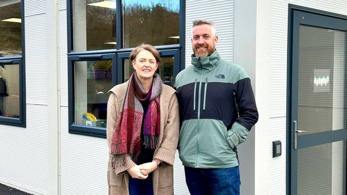 Principal Ríona Murray and Christopher O'Sullivan in front of the new classroom at Glandore National School.