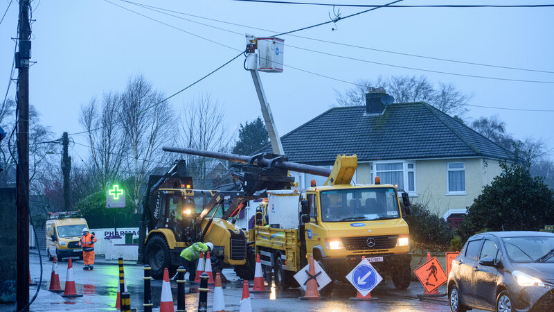 ESB crews working on broken power lines on the Ballinlough Road, Cork yesterday as Storm Isha hits the south of the country. Picture Dan Linehan