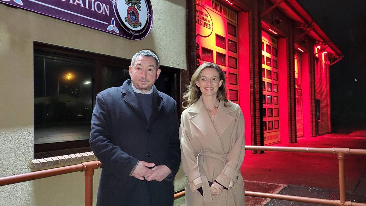 Social Democrats candidate for Cork City South West Ciarán McCarthy with party leader Holly Cairns at Ballincollig fire station.