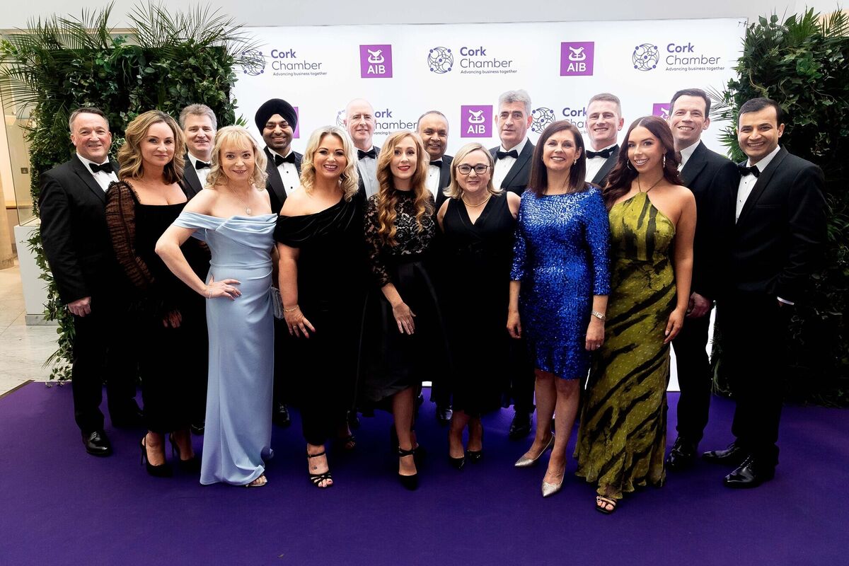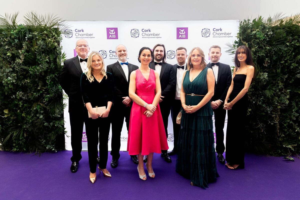 PepsiCo executives Mary Lane, Clodagh Thompson, and Pankaj Agarwal, pictured on stage receiving the award for Overall Cork Company of The Year from Ronan Lane, President, Cork Cjamber; Sinead Scully, Vodafone Ireland, Sinead Bryan, Vodafone Ireland, and Conor Healy, Cork Chamber, at the 2024 Cork Chamber annual dinner, held at Cork City Hall. Cork Chamber welcomed 1000 guests to the event which was sponsored by AIB. Picture: Michael O'Sullivan /OSM PHOTO