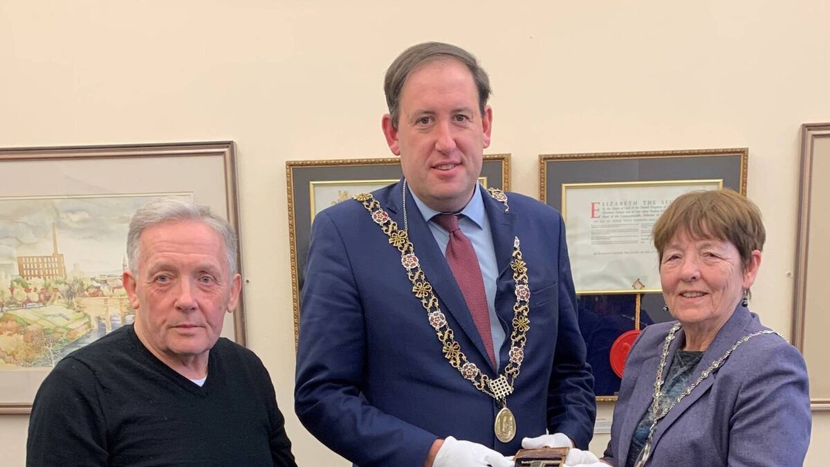 Lord Mayor of Cork. Councillor Kieran McCarthy, receiving the shaving kit of Commandant Leo Murphy from Dublin-born Deputy Mayor of Tameside, Councillor Betty Affleck, right, and executive leader, Councillor Gerald Cooney (also of Irish descent).