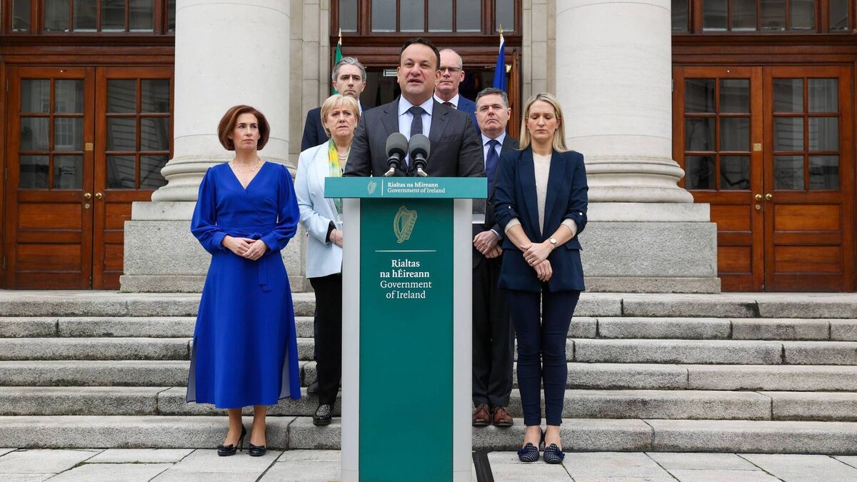 Taoiseach giving his statement on the steps of Government Buildings Taoiseach Leo Varadkar at then podium on the steps of Government Buildings flanked by Minister Naughton, Minister Humphreys, Minister Harris, Minister Coveney, Minister Donohoe and Minister McEntee.