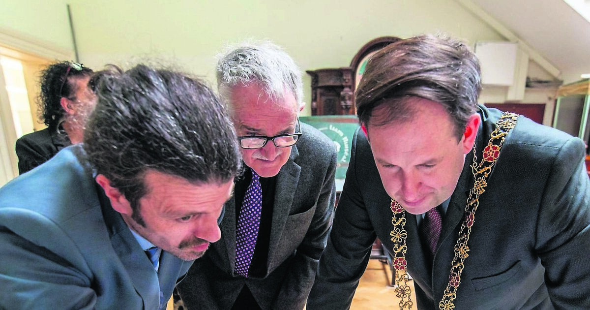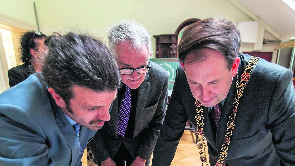 SPEC: Curator of the Cork Public Libray and Richard Beamish showing the Lord Mayor of Cork Councillor Kieran McCarthy, additional information relating to the shaving kit belonmging to Leo Murphy, the IRA cimmander who was killed during the War of Independence: Cork Public Museum hosted an event to mark the return to Cork of a small shaving kit used by Commandant Leo Murphy who died at the hands of Crown Forces during the War of Independence. Picture: Noel Sweeney
