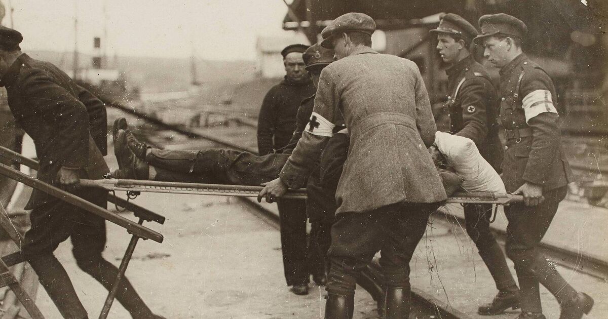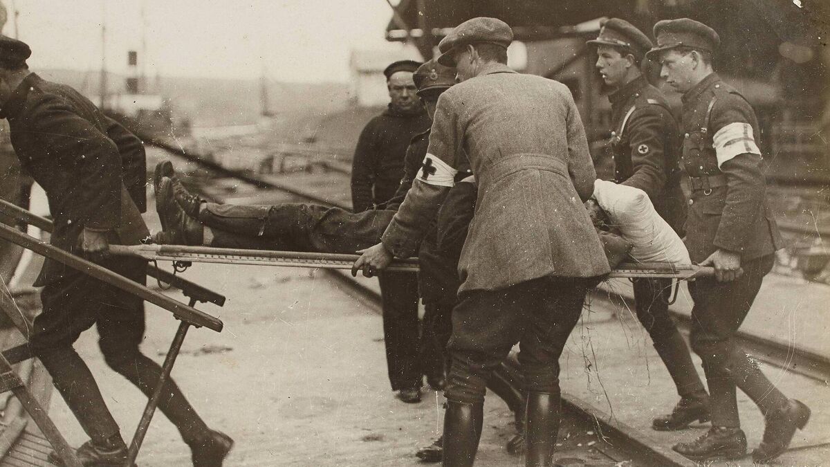 A soldier wounded after the National Army landing on Passage West, County Cork being conveyed to the base hospital on board the Lady Wicklow [Image: National Library of Ireland]