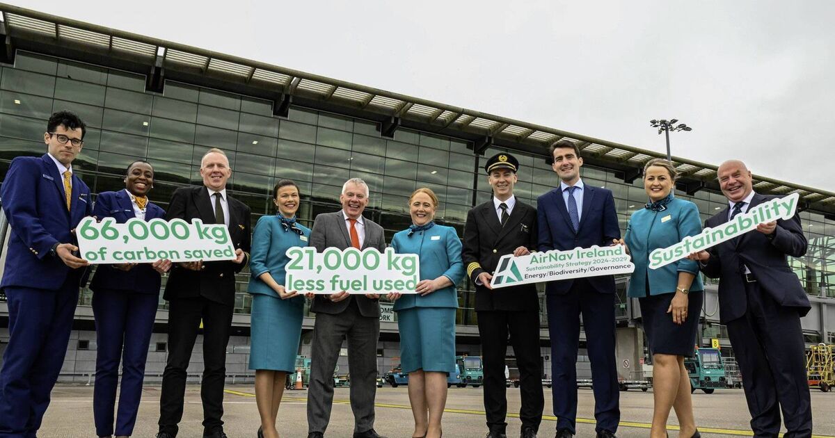 AirNav Ireland launched its new Sustainability Plan 2024-2029. As part of this commitment, AirNav Ireland recently initiated a trial with Ryanair and Aer Lingus for aircraft arriving at Cork Airport. Pictured are Dr. Peter Kearney, CEO AirNav Ireland; Jack Chambers, Minister of State, Dept of Transport along with Niall MacCarthy, Managing Director, Cork Airport. Included are Seamus Cooke, Aer Lingus Base Captain, Cork and Jim Allen, Deputy Base Captain, Ryanair, Cork. Also included are Catherine Cooke , Sinead Larkin and Tracey Browne, all Aer Lingus with Zane Rosemont and Yuri Aquilini, Ryanair. Pic: Brian Lougheed