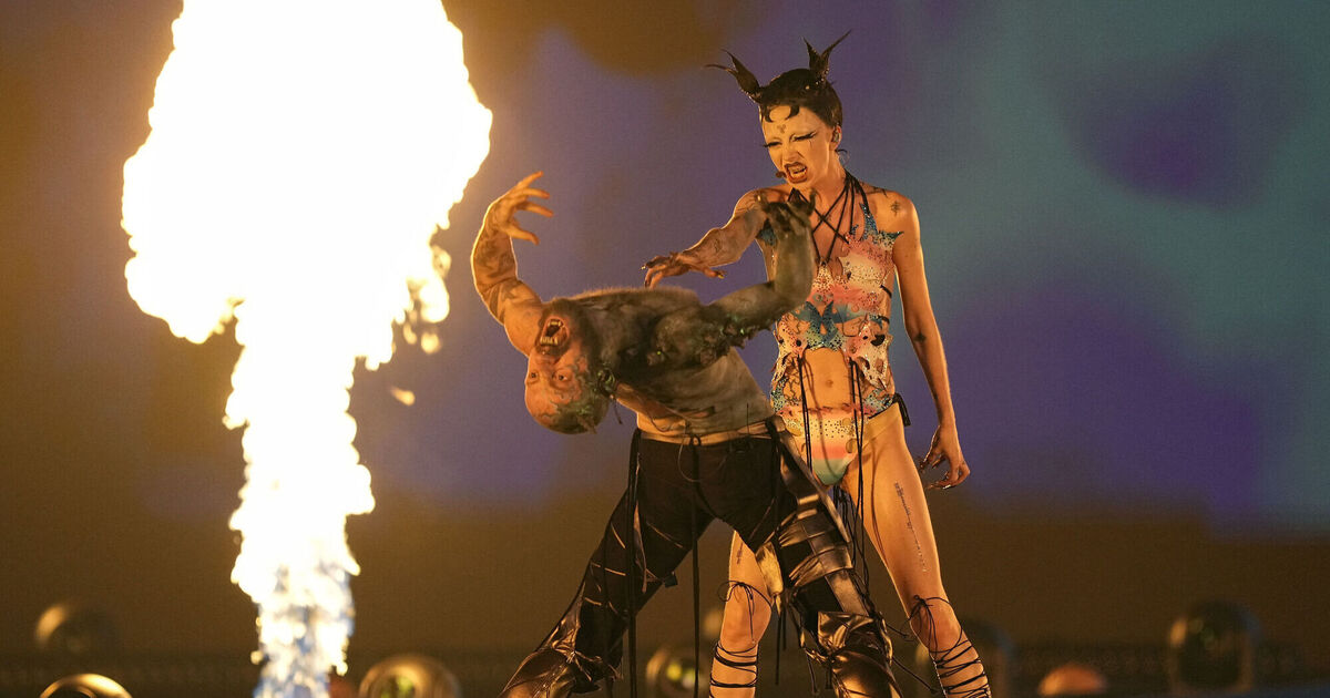 Bambie Thug of Ireland performs the song Doomsday Blue during the dress rehearsal for the final at the Eurovision Song Contest in Malmo, Sweden, Friday, May 10, 2024. (AP Photo/Martin Meissner)