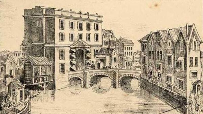 Bosanquet’s painting of the 18th century County Goal, South Gate Bridge and Globe Lane tenements on the right.Painting: Courtesy, Cork City Library.