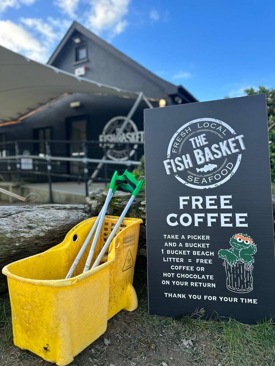 They run a promotion where patrons can take a bucket and a litter picker and collect rubbish left on the beach, and get a free coffee for their efforts when they return the bucket of litter to the restaurant.