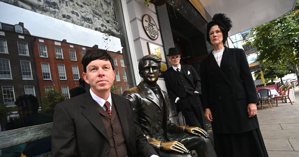 Jim O’Mahony, as Michael Collins; Ethan Dillon, as Éamon de Valera; along with Jean van Sinderen-Law, as Countess Markievicz; seated outside the Imperial Hotel, South Mall, Cork, where Collins spent his last night before his death at Béal na Bláth.