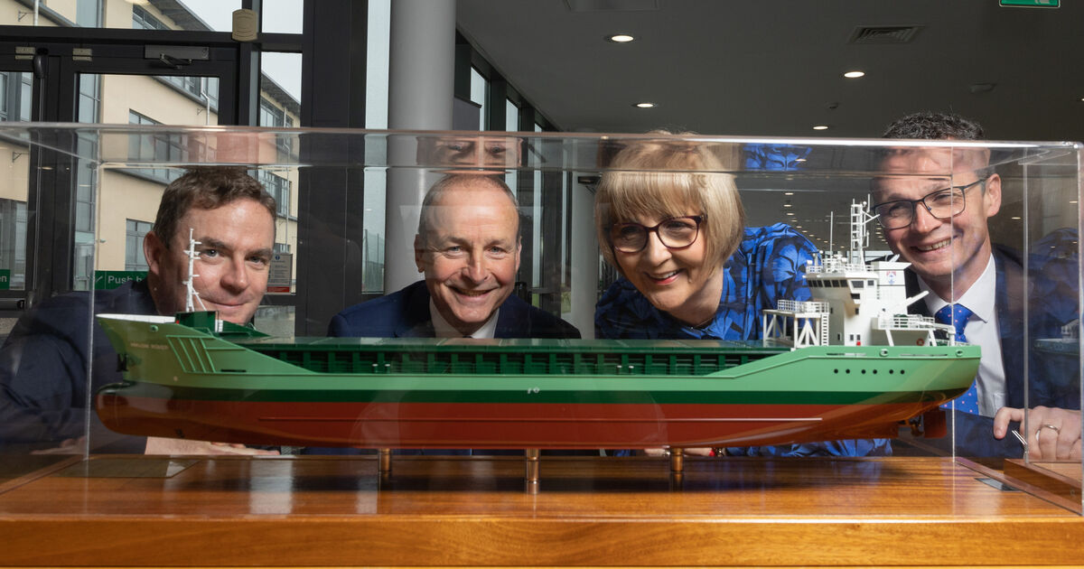 Head of the NMCI Paul Hegarty; Tánaiste Micheál Martin; MTU president Maggie Cusack, and Higher Education Minister Patrick O’Donovan looking at a model of the MV Arklow while attending a special event to mark the 20th anniversary of the college in Ringaskiddy. Picture: Darragh Kane.
