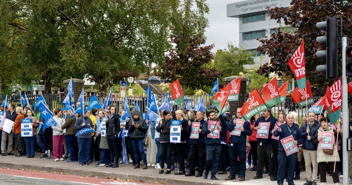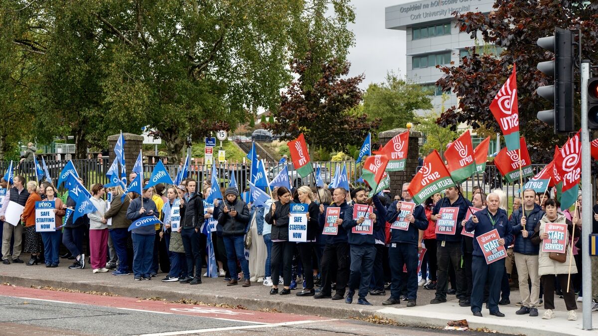 Forsa and Siptu and members pictured outside CUH last Thursday where a large number of hospital staff staged a lunchtime protest on staffing shortages and the impact of the recruitment freeze. Picture: Chani Anderson.