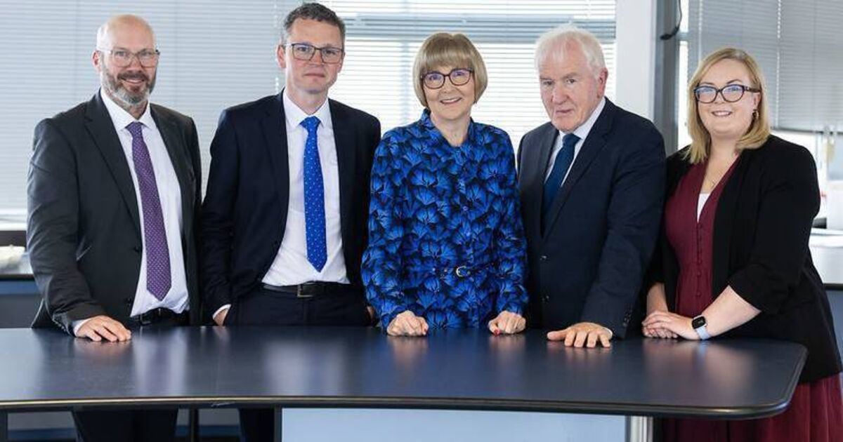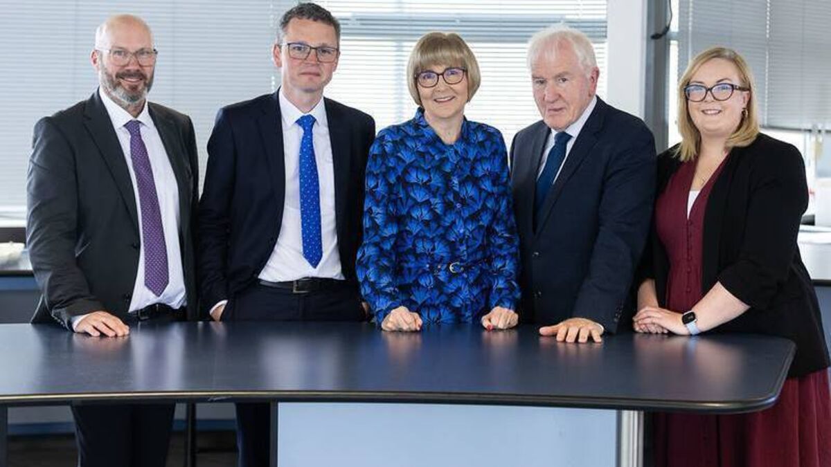 Hugh McGlynn, VP for Research and Innovation MTU, Patrick O'Donovan TD, Minister of Further and Higher Education, Research, Innovation and Science, President of MTU Prof Maggie Cusack, Jimmy Deenihan, Chair of Governing Body MTU and Marie Harnett, Managing Authority SEM Regional Programme which funds TU Rise at the launch of the Research to Impact TU Rise programme. Picture: Darragh Kane