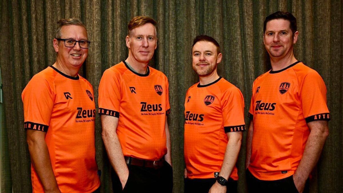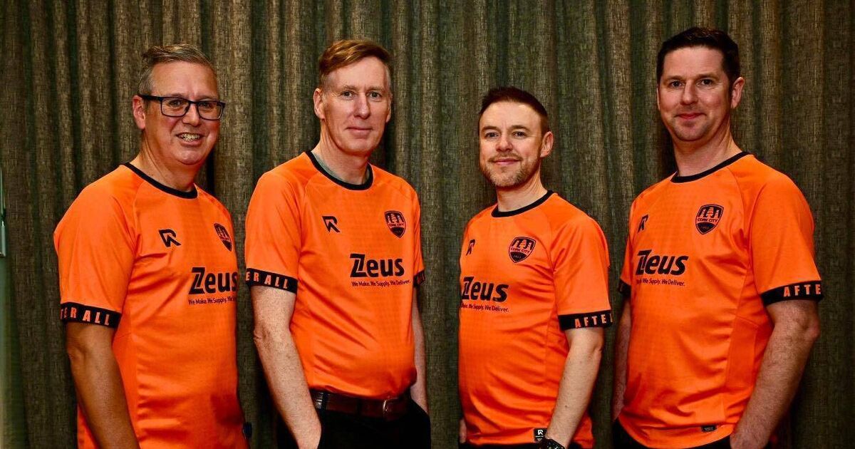The Frank and Walters model the new Cork City FC away jersey for the 2025 season.