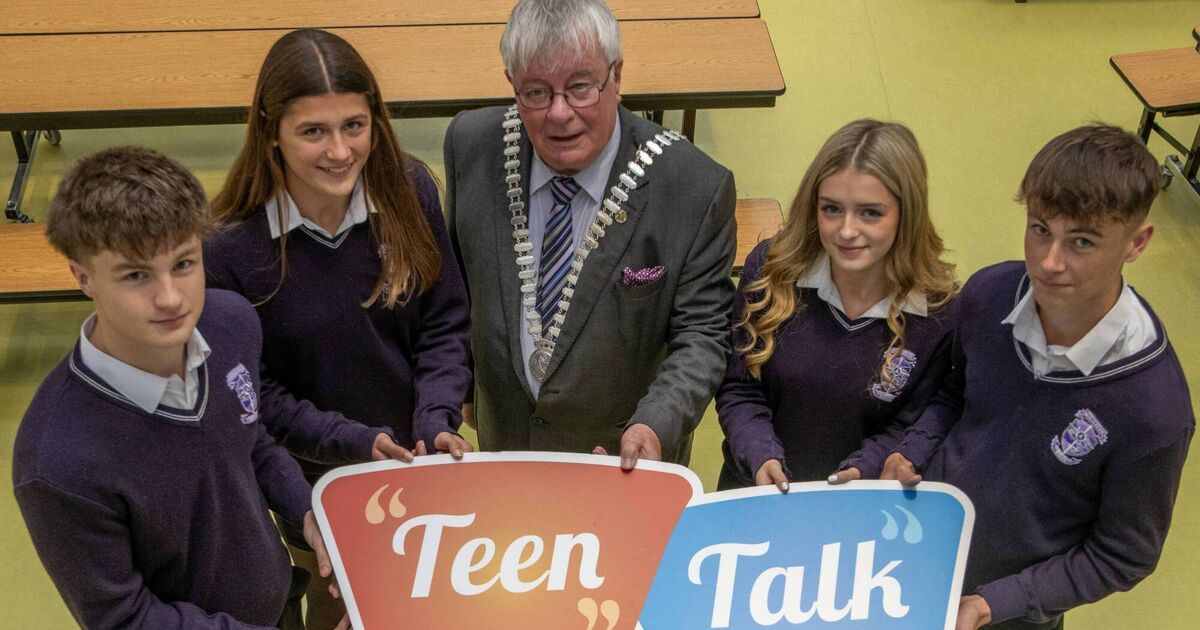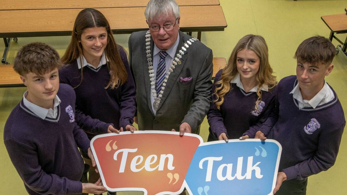 Hundreds of Cork students are expected to attend a Teen Talk event tomorrow to promote positive mental health. Featured at the launch were students and teachers from Skibbereen Community School with Mayor of County Cork, Cllr Joe Carroll. Pictured (L/R): Jason Collins, Holly O'Flynn, Mayor of the County of Cork, Cllr Joe Carroll, Lily Rees and William Doyle. Photo: Colm Lougheed