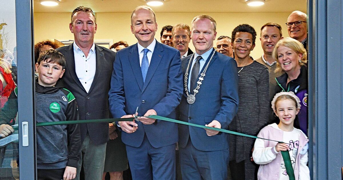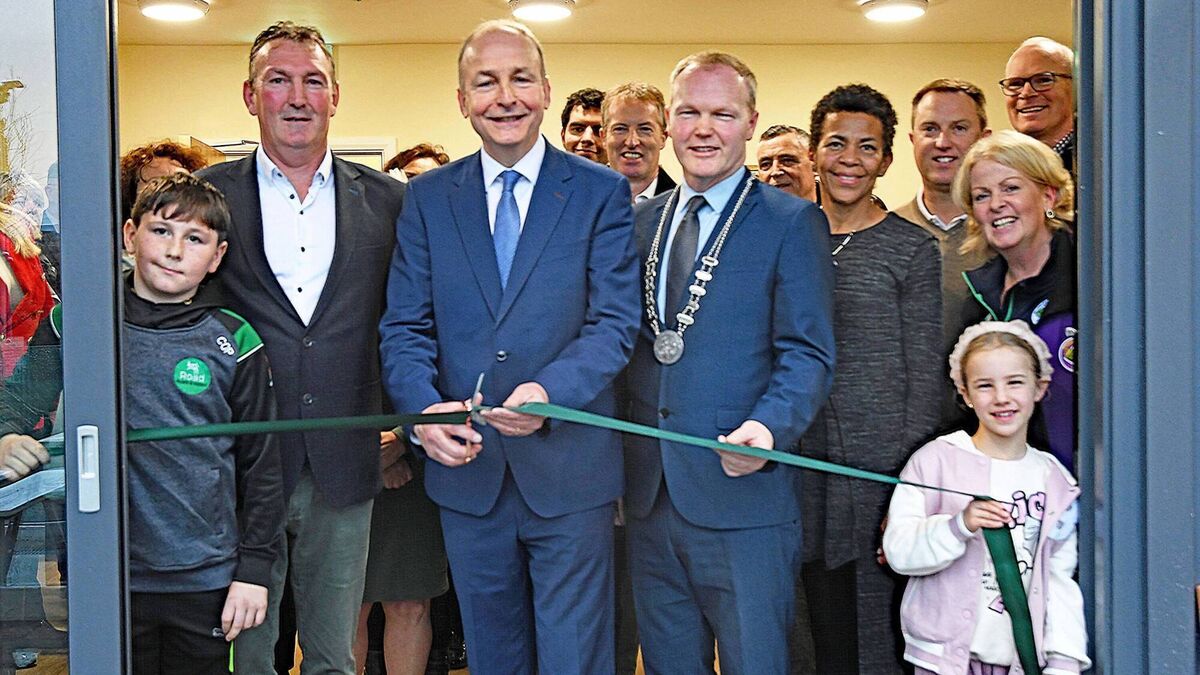 Crosshaven Tennis Club hosted an official re-opening of the facility’s clubhouse last week following extensive refurbishment works. Pictured is Tánaiste Micheál Martin cutting the ribbon alongside Philip Neville, club president; councillor Séamus McGrath deputising for the County Mayor of Cork, and club members. Photo: Siobhán Russell