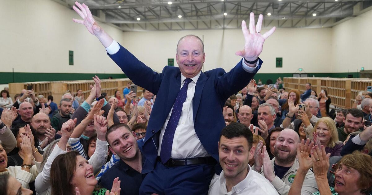 Fianna Fail leader Micheal Martin is hoisted up by his sons Cillian and Micheal Aodh, after he was deemed elected in the Cork South Central constituency. Photo: Jacob King/PA Wire