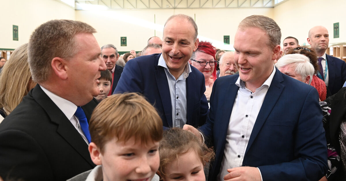 Newly elected TD Seamus McGrath , Fianna Fáil, with (left) his brother EU Commissoner Michael McGrath and Tanaiste Micheál Martin at the general election count centre at Nemo Rangers on Sunday. Picture: Larry Cummins.