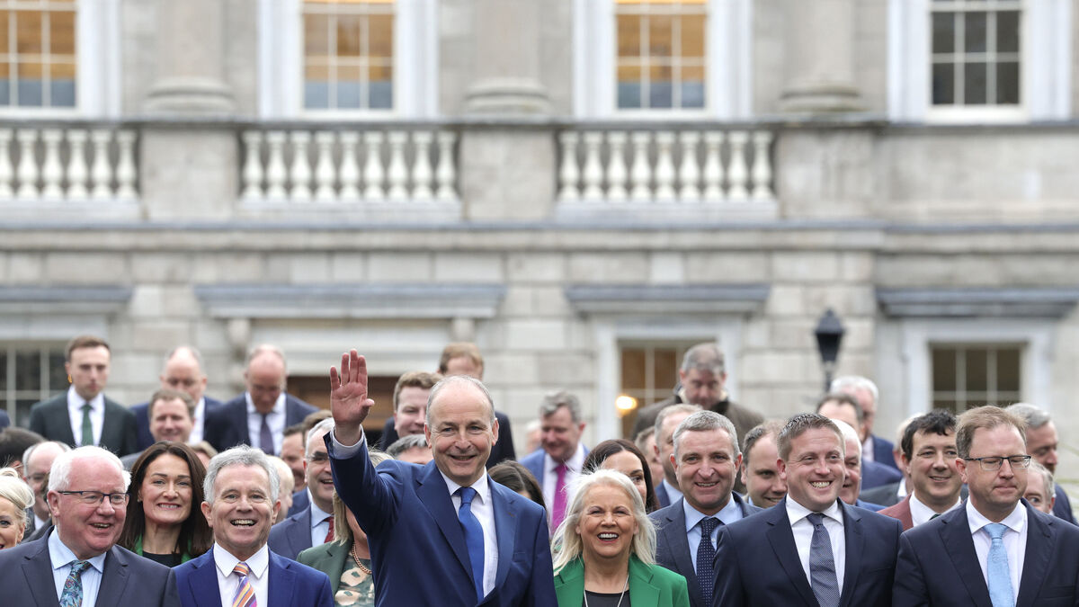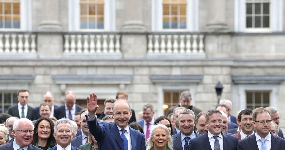 Fianna Fáil Leader Micheal Martin, leads out his victorious group of TDs to the front of Leinster House today. Photo: Leah Farrell/© RollingNews.ie