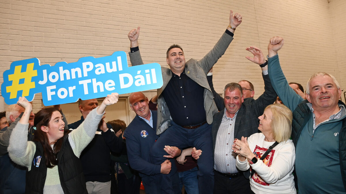 Fine Gael's John Paul O'Shea lifted aloft by jubilant supporters following his election to the Dáil in the Cork North West constituency. Picture: Eddie O'Hare.