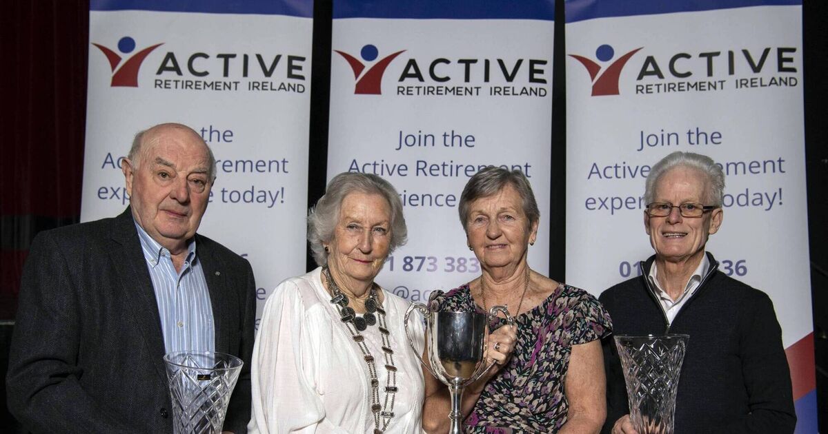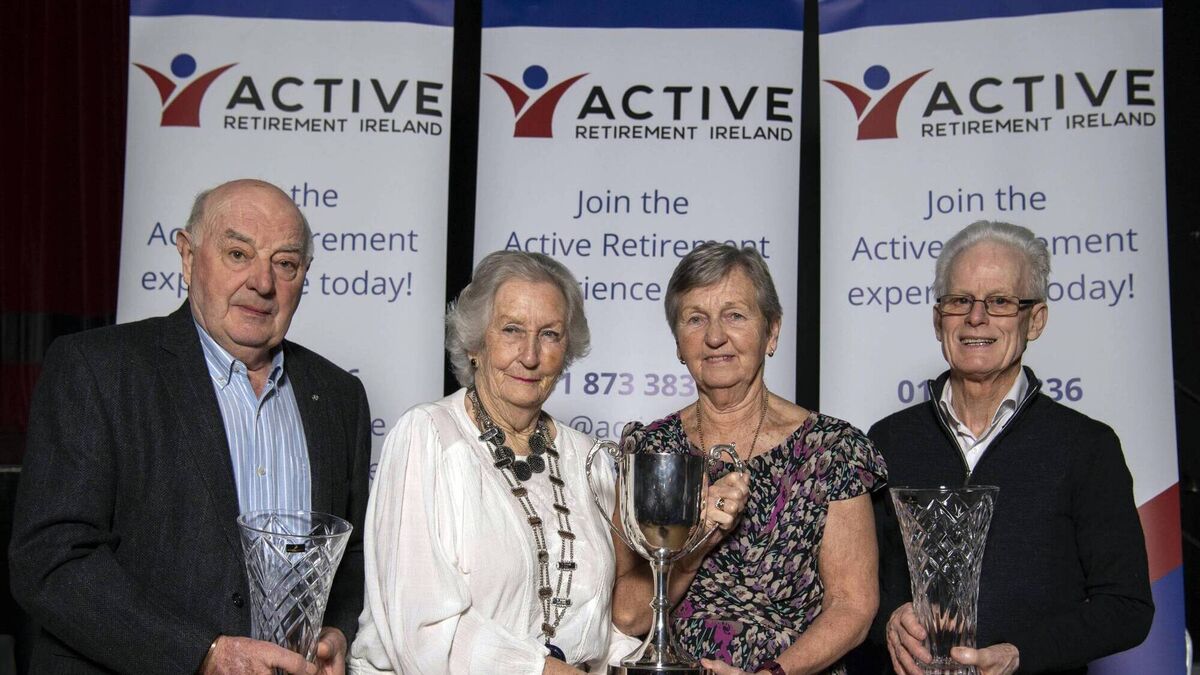 The Magpies Team from Midleton, Denis Mulcahy, Denis Heffernan and Breda Treacy pictured with Mai Quaid, President, ARI at the Active Retirement Ireland National Bowls finals in the Gleneagle INEC, Killarney. Picture: Don MacMonagle.