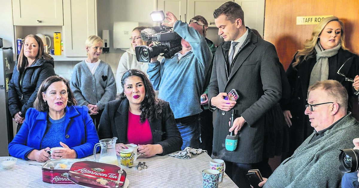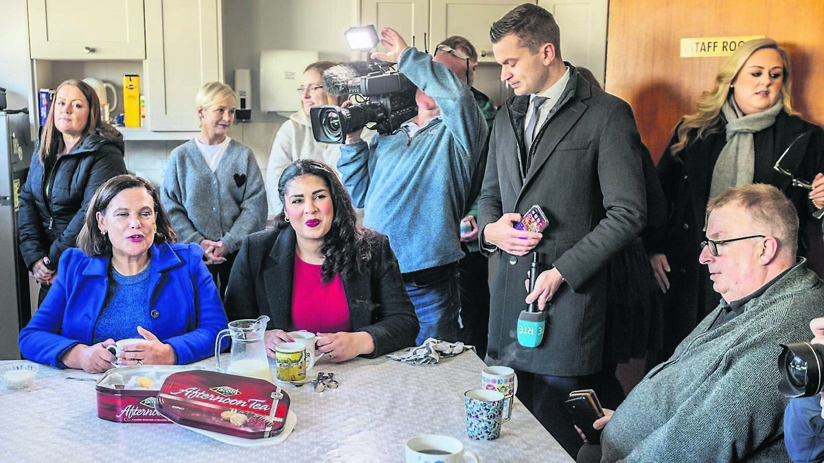 Sinn Féin party leader Mary Lou McDonald with Cork North West candidate, Nicole Ryan, and members of the media during a tea break in the staff room of Presentation National School, Millstreet, during a canvass in Millstreet. Picture: Neil Michael