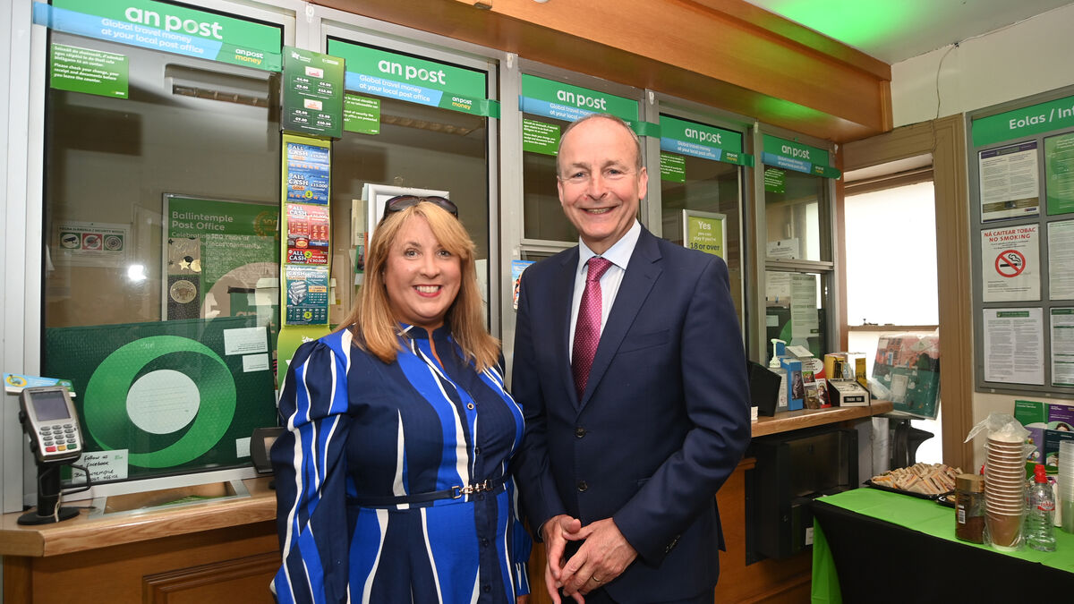 Postmistress Colette Collins with Tanaiste Micheal Martin at the 100th anniversary celebrations at Ballintemple Post Office, Mathew Place, Balllintemple, Cork on Friday 7th June 2024. Pic Larry Cummins