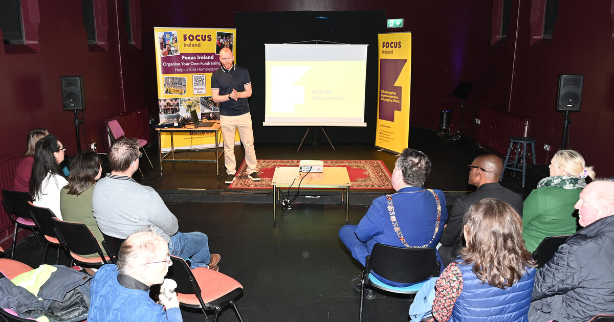 Cian Dalton, community fundraiser for Focus Ireland, speaking to guests at the awareness event for Focus Ireland held at Graffiti Theatre, Assumption Road, Black pool. The housing charity aims to secure more than 100 new properties for homeless people across Cork and Kerry over the next two years.