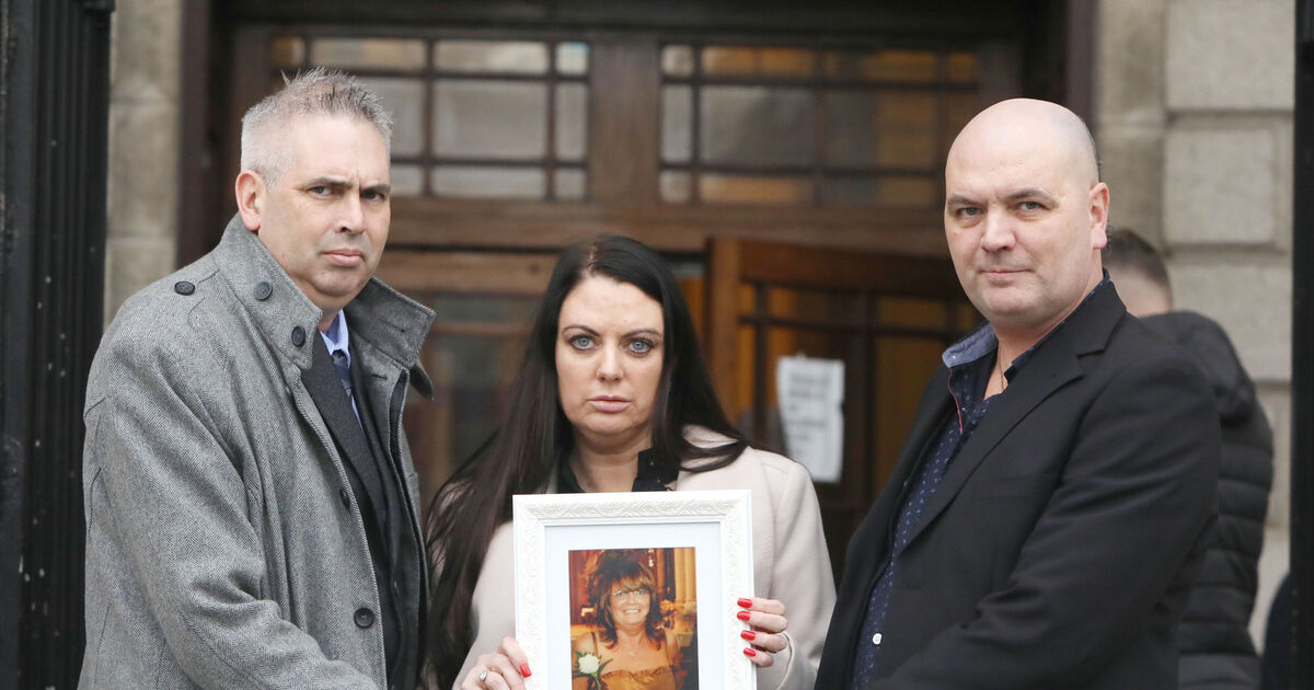 Niall and Shane Halligan stand with their sister Aoife Halligan Brown who is holding a photo of her late mother Aileen Halligan, they settled a High Court action against a cardiologist over the death of their mother from Cobh Co Cork. Photo Collins Courts