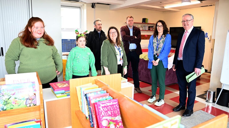 Minister of State at the Department of Education and Youth with special responsibility for Special Education and Inclusion, Michael Moynihan, chatting with Sue Lenihan principal of St Killians school in Mayfield (second right); pupils Jean Connolly and Lottie McKiernan; teacher, Aisling Murphy and Padraig O'Sullivan TD. Picture: Eddie O'Hare.