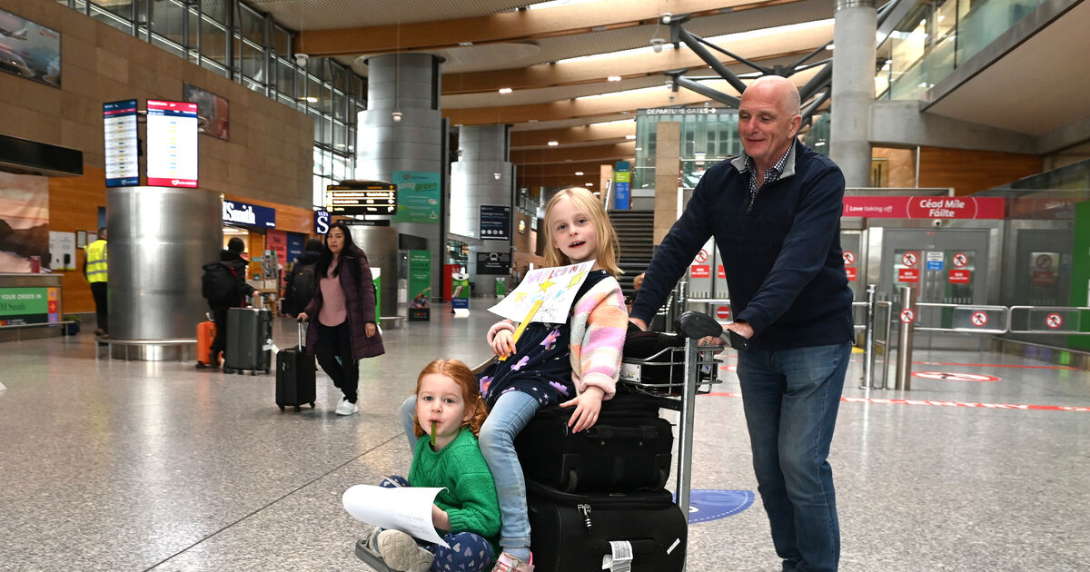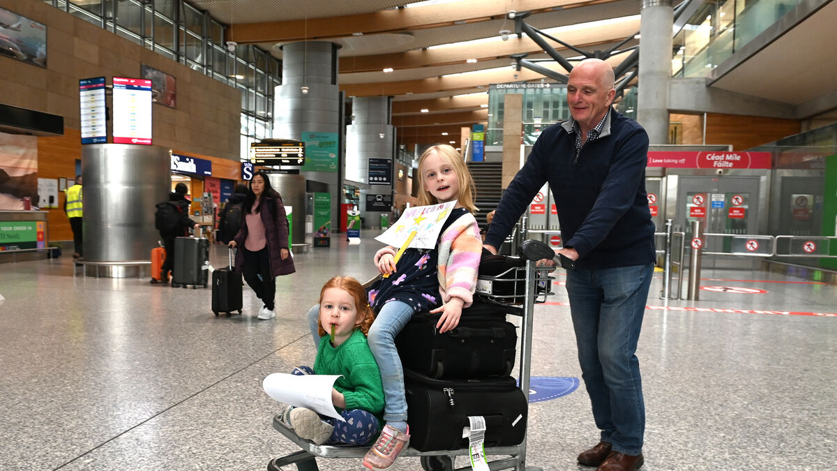 Sisters Roisin and Eve Crowley, from Clonakilty, greeted their grandad Peter Dolan, originally from Co Roscommon and now living in Melbourne, Australia. Peter’s flight was due to arrive into Londow Heathrow, but was diverted to Paris.