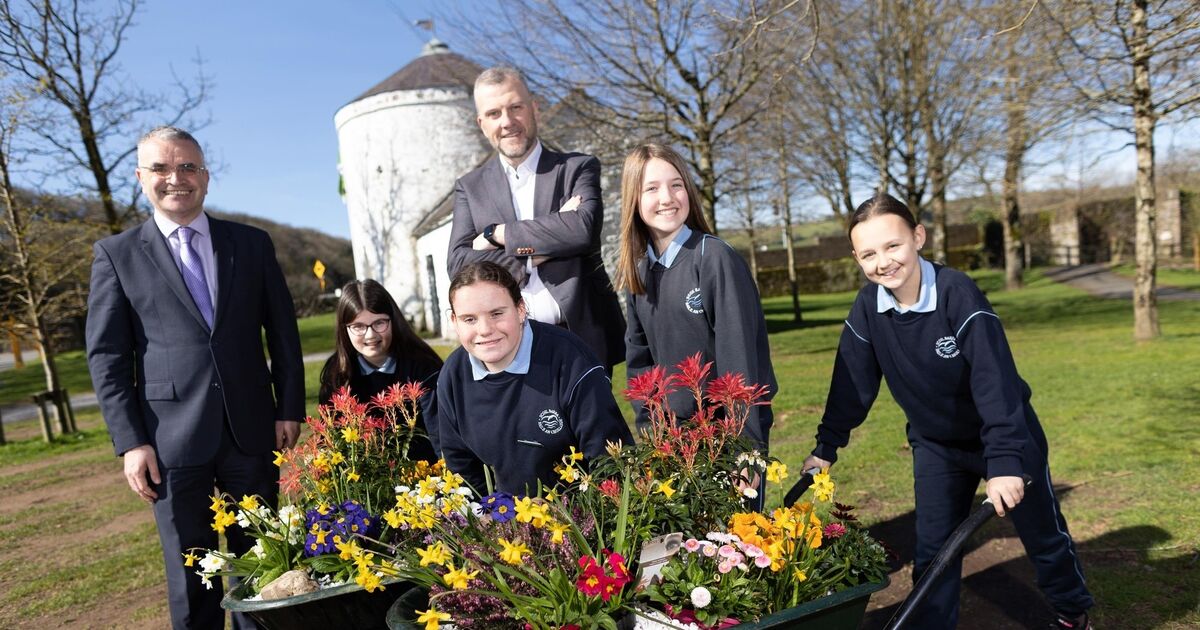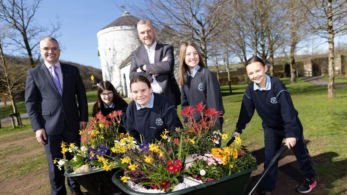 Monika Vondrackova, Clara Moynihan, and Hailey O’Callaghan with rural and community development minister Dara Calleary, far left, and SuperValu managing director Luke Hanlon launching the 2025 SuperValu Tidy Towns competition in Ballincollig.