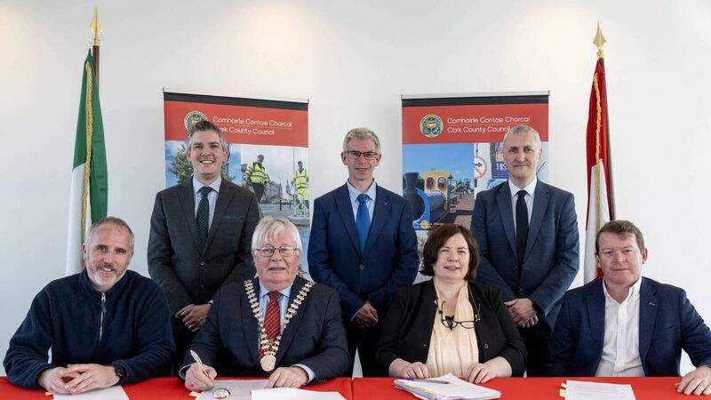 Pictured at the contract signing for the Oldcourt Road Realignment project in Skibbereen are front, from left: Jamie Twomey, O’Connor Sutton Cronin; Mayor of the County of Cork, Cllr. Joe Carroll; Chief Executive of Cork County Council, Moira Murrell; Dan Murphy McGinty & O’Shea Ltd. Back row, from left: Liam Ahearn, Senior Engineer; Divisional Manager, Niall Healy and Padraig Barrett, Director of Services, Cork County Council. Picture: Brian Lougheed